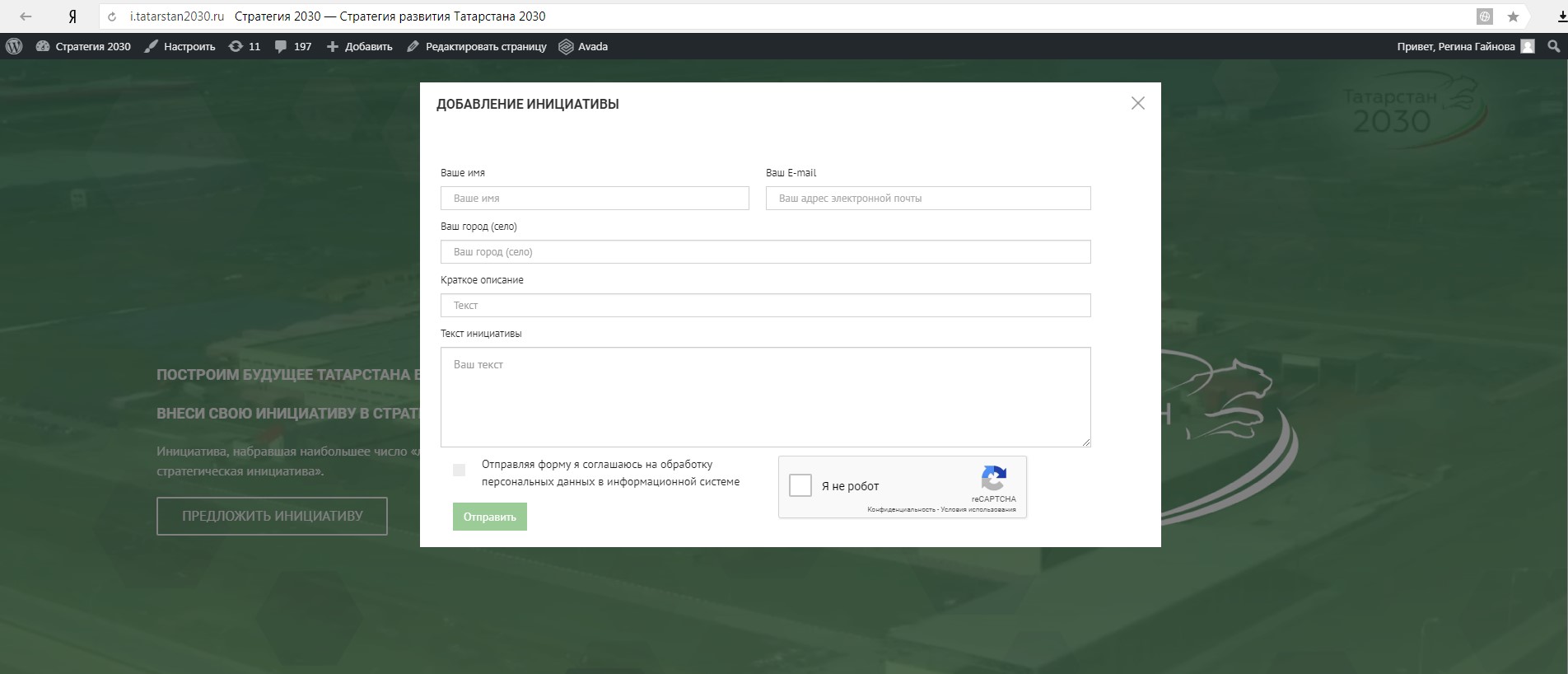 2. В появившемся окне необходимо заполнить все данные, в том числе «Ваше имя», «Ваш E-mail», «Ваш город (село)», «Краткое описание инициативы» и «Текст инициативы». Далее необходимо поставить галочку рядом с текстом «Отправляя форму я соглашаюсь на обработку персональных данных в информационной системе», а также поставить галочку рядом с текстом «Я не робот» и пройти проверку. После этого необходимо нажать на кнопку «Отправить».