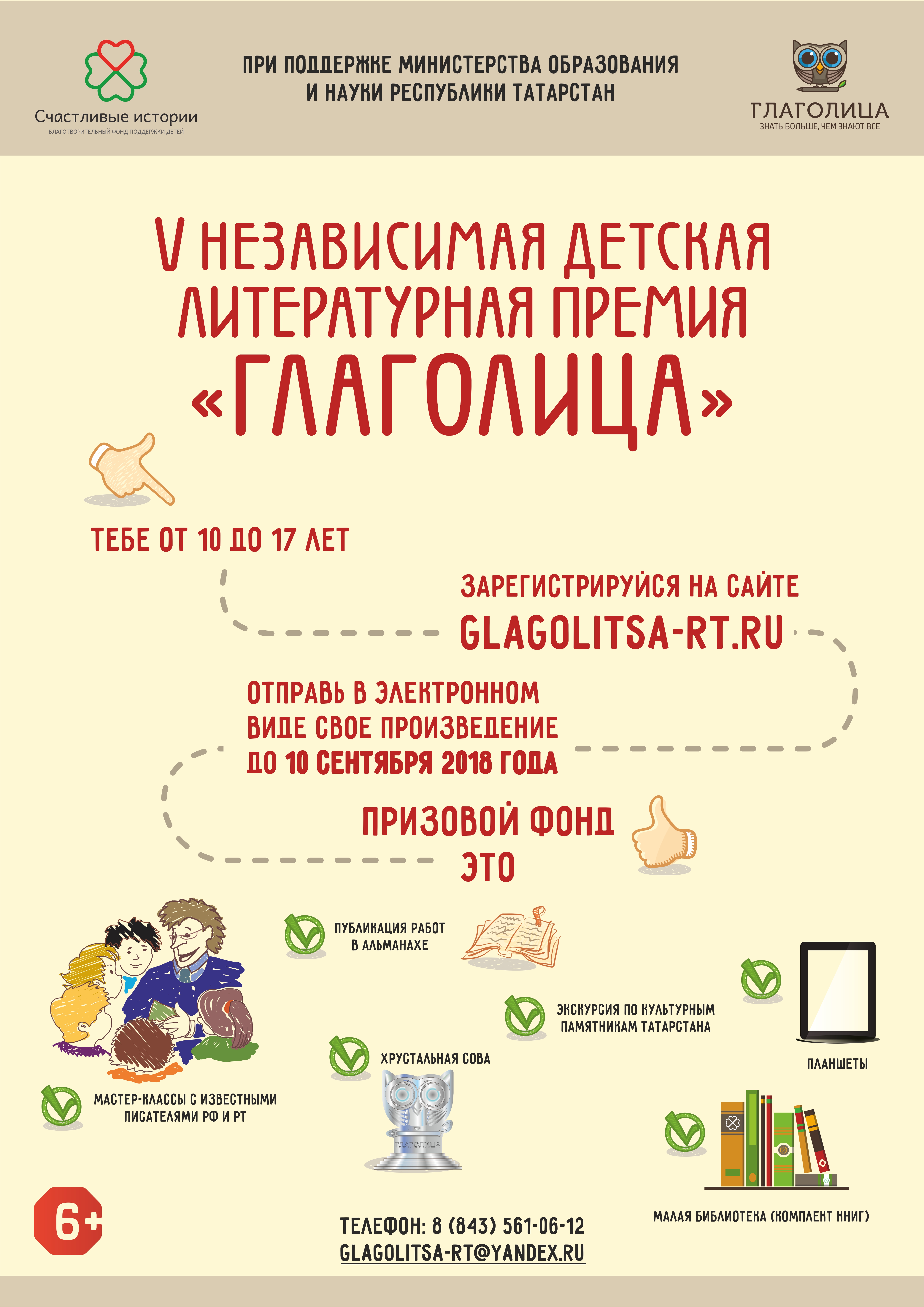 БФ «Счастливые истории» запустил ежегодный конкурсный сезон Независимой детской литературной премии «Глаголица» среди юных авторов из России, стран ближнего и дальнего зарубежья, пишущих на русском и татарском языках.