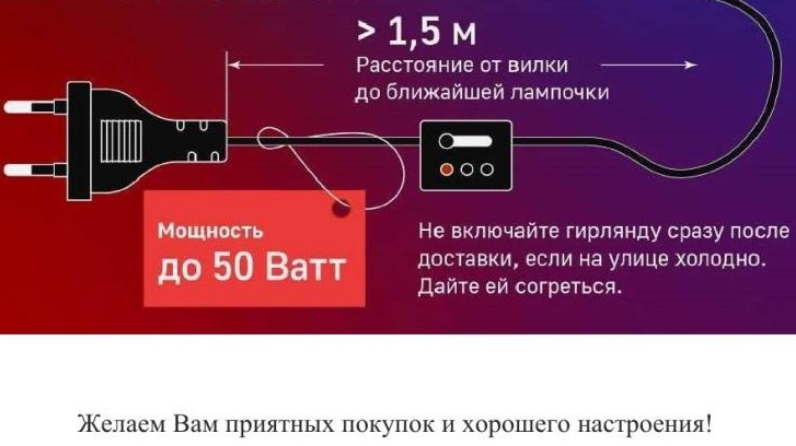 Выбирая гирлянду, обратите внимание на маркировку - в документах, прилагаемых к гирлянде, на самом товаре или на упаковке, обязательно должна быть представлена следующая информация на русском языке: