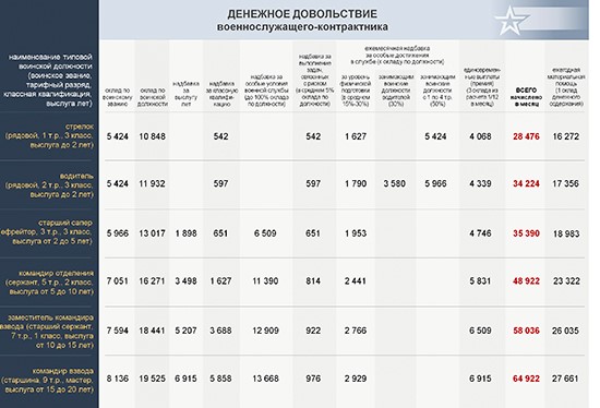 Средний размер денежного довольствия военнослужащих по контракту, замещающих воинские должности рядового и сержантского состава, с учетом всех ежемесячных и иных дополнительных выплат денежного довольствия, возрастает по мере увеличения выслуги лет, должностного уровня, уровня профессионального мастерства, региональных коэффициентов и ежегодной индексации.