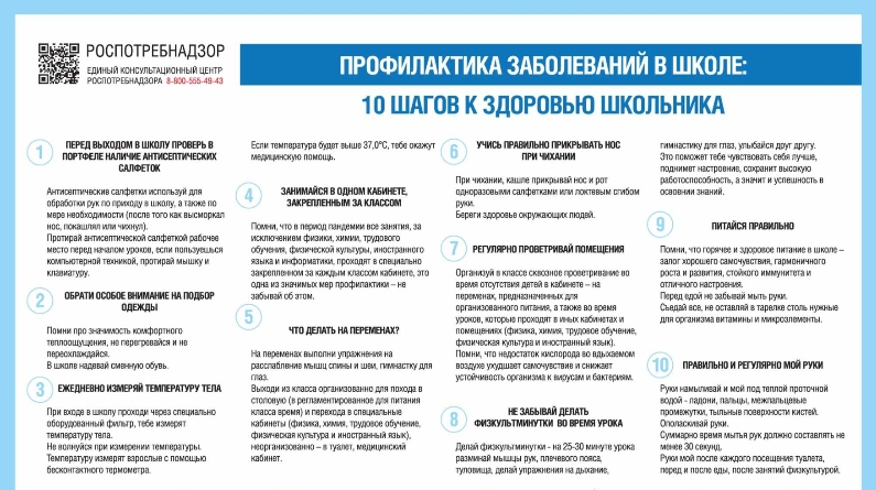 Памятка для детей по профилактике заболеваний в школе 10 шагов к здоровью школьника 1) Перед выходом в школу проверь в портфеле наличие антисептических салфеток. Антисептические салфетки используй для обработки рук по приходу в школу, а также по мере необходимости (после того как высморкал нос, покашлял или чихнул). Протирай антисептической салфеткой рабочее место перед началом уроков, если пользуешься компьютерной техникой, протирай мышку и клавиатуру. |