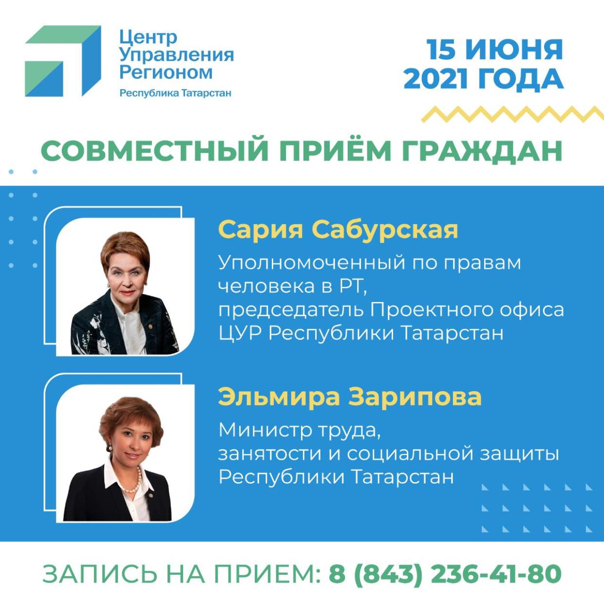 15 июня 2021 года состоится совместный прием граждан Уполномоченным по правам человека в Республике Татарстан и Министром труда, занятости и социальной защиты Республики Татарстан. У жителей муниципальных районов республики есть возможность задать свои вопросы посредством прямого подключения через программы «Skype» или «Zoom».