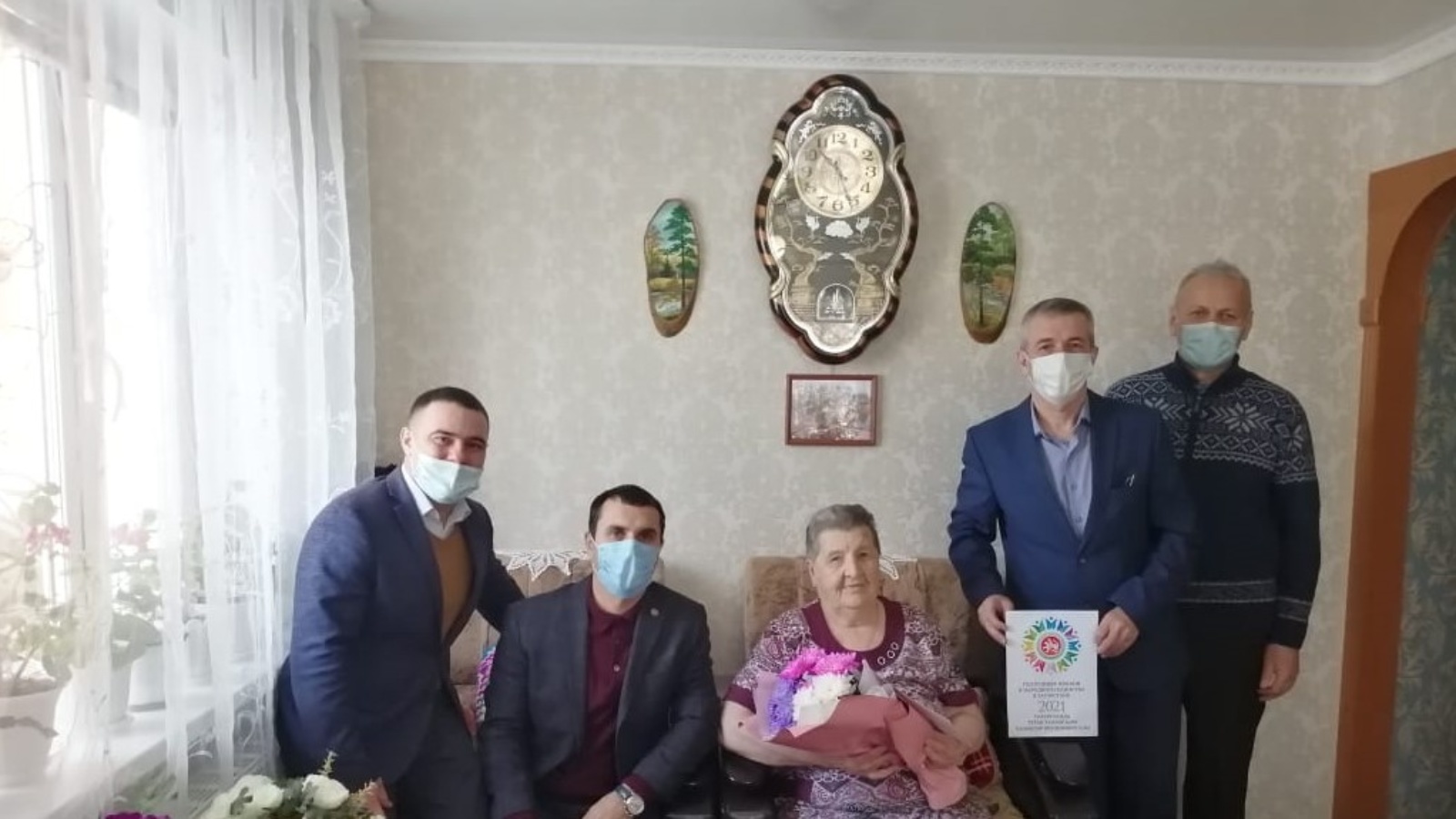 С искренними пожеланиями долголетия, здоровья была вручена открытка Президента Российской Федерации Владимира Владимировича Путина и лично от себя Ильдар Рашитович вручил памятный подарок.