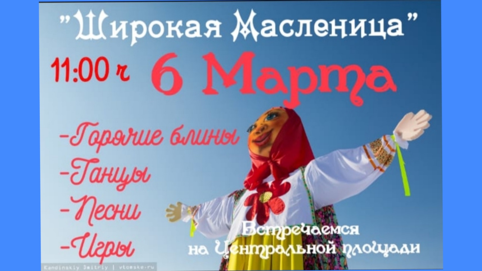 6 марта приглашаем всех на массовое гуляние "Широкая Масленица" - Горячие блины - Песни -Танцы -Игры Начало 11:00 часов Встречаемся на Центральной площади.