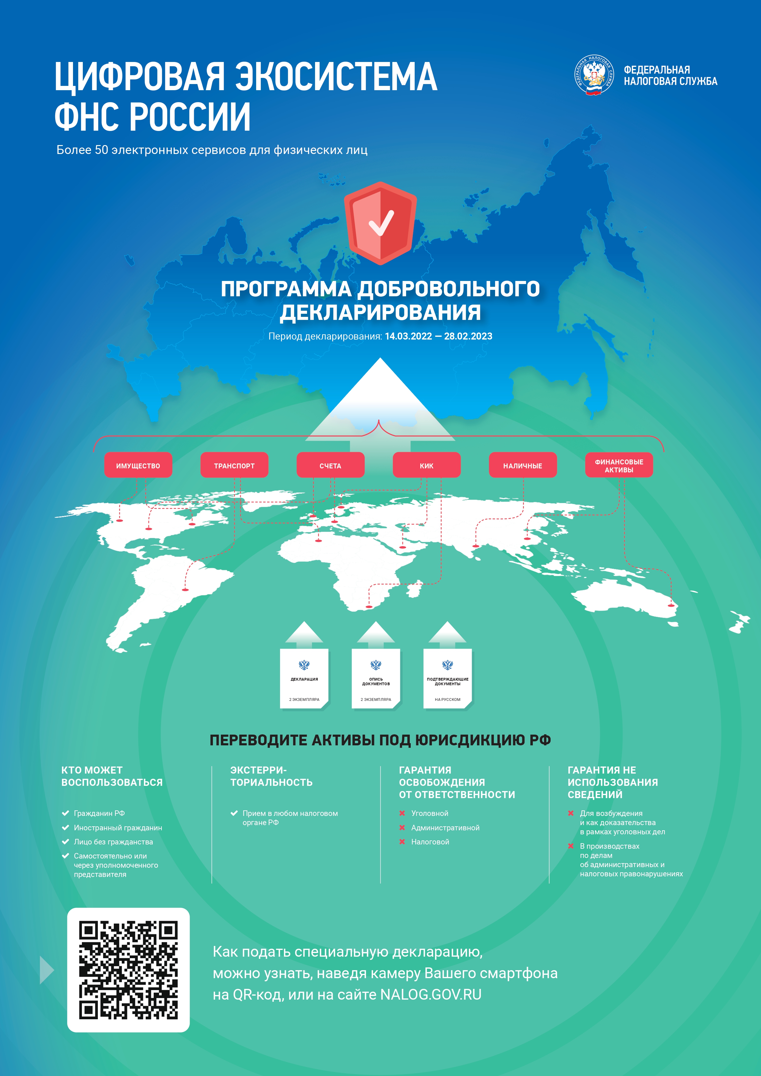 Уважаемые налогоплательщики! ТЕЛЕФОН «ГОРЯЧЕЙ ЛИНИИ» 8 (800) 222-22-22 С 14 марта 2022 года по 28 февраля 2023 года Федеральная налоговая служба осуществляет прием специальных деклараций в рамках четвертого этапа добровольного декларирования в соответствии с Федеральным законом от 08.06.2015 № 140-ФЗ «О добровольном декларировании физическими лицами активов и счетов (вкладов) в банках и о внесении изменений в отдельные законодательные акты Российской Федерации» (в редакции от 09.03.2022). Декларант вправе лично или через уполномоченного представителя подать специальную декларацию в любом территориальном налоговом органе или в центральном аппарате ФНС России. Декларация подается в двух экземплярах. WWW.NALOG.GOV.RU