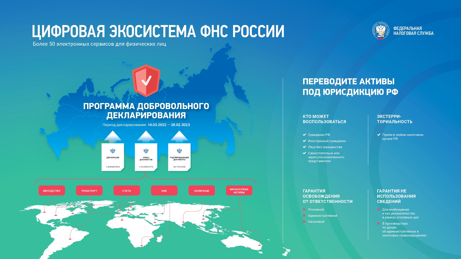До 28 февраля 2023 года физические лица имеют возможность сообщить о своих счетах и вкладах в заграничных банках Форма специальной декларации и порядок ее заполнения и представления размещены на официальном сайте ФНС России в разделе «Специальная декларация» До 28 февраля 2023 года физические лица имеют возможность сообщить о своих счетах и вкладах в заграничных банках, ценных бумагах, долях участия в иностранных организациях, а также о контролируемых иностранных компаниях. В рамках четвертого этапа могут быть задекларированы и другие финансовые активы, например, производные финансовые инструменты. Также физические лица вправе задекларировать наличные деньги при условии, что положат их на счёт в российском банке в течение 30 дней со дня представления декларации. При декларировании транспортных средств указываются сведения об их перерегистрации в соответствующих государственных реестрах Российской Федерации. В рамках четвертого этапа добровольного декларирования сохраняются гарантии освобождения декларанта и (или) лица, информация о котором содержится в специальной декларации, от уголовной, административной и налоговой ответственности при условии зачисления денежных средств и финансовых активов на счета в российских банках и организациях финансового рынка. ФНС России обеспечивает режим конфиденциальности содержащихся в специальной декларации сведений, не вправе передавать их третьим лицам и государственным органам и использовать для целей осуществления мероприятий налогового контроля.