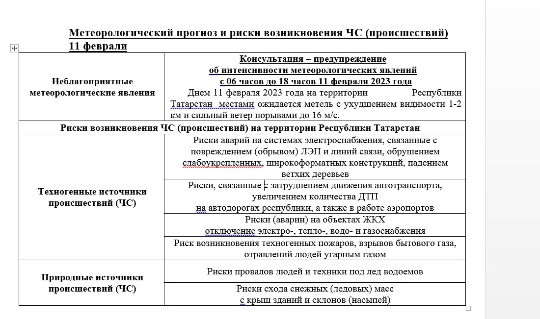 ЕЖЕДНЕВНЫЙ ОПЕРАТИВНЫЙ ПРОГНОЗ возникновения чрезвычайных ситуаций на территории Республики Татарстан на 11 февраля 2023 года