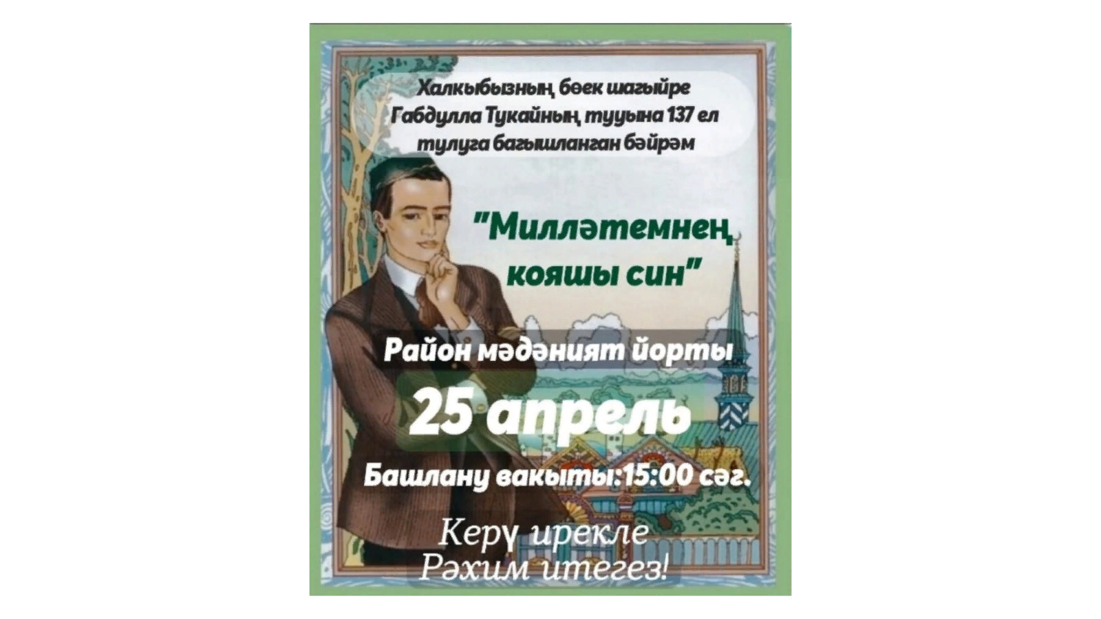 25 апреля в районном доме культуры состоится праздник "Ты солнце моей нации", посвящённый 137- летию со дня рождения великого поэта Габдуллы Тукая. Начало в: 15:00 часов Место проведения: Районный дом культуры Добро пожаловать!