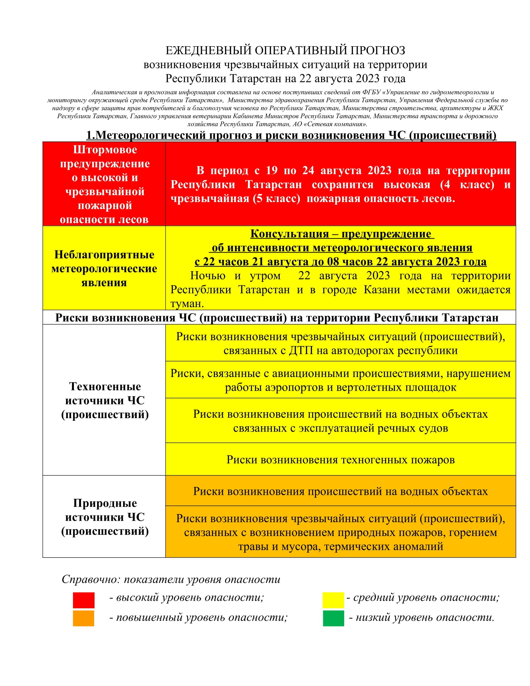 ЕЖЕДНЕВНЫЙ ОПЕРАТИВНЫЙ ПРОГНОЗ возникновения чрезвычайных ситуаций на территории Республики Татарстан на 22 августа 2023 года