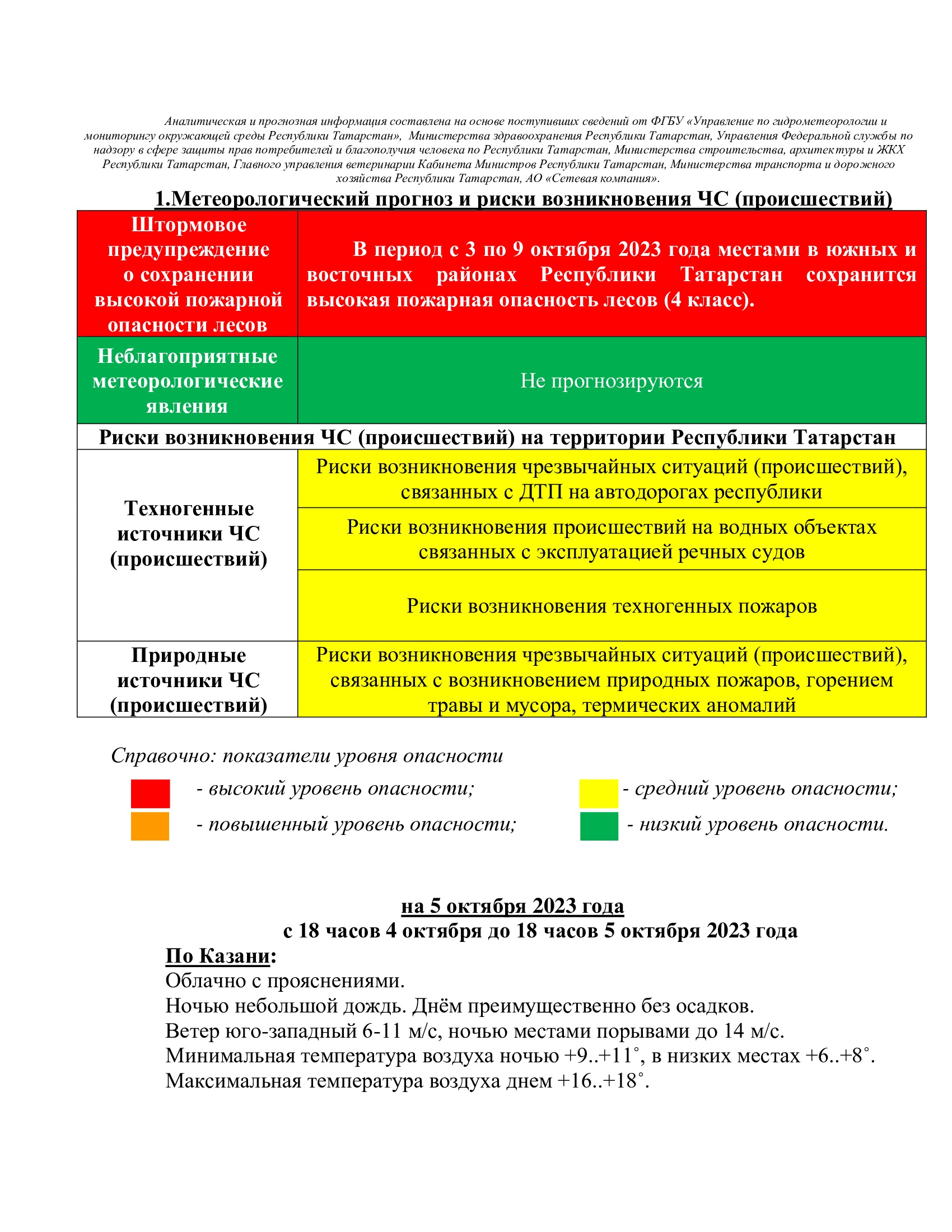 ЕЖЕДНЕВНЫЙ ОПЕРАТИВНЫЙ ПРОГНОЗ возникновения чрезвычайных ситуаций на территории Республики Татарстан на 5 октября 2023 года