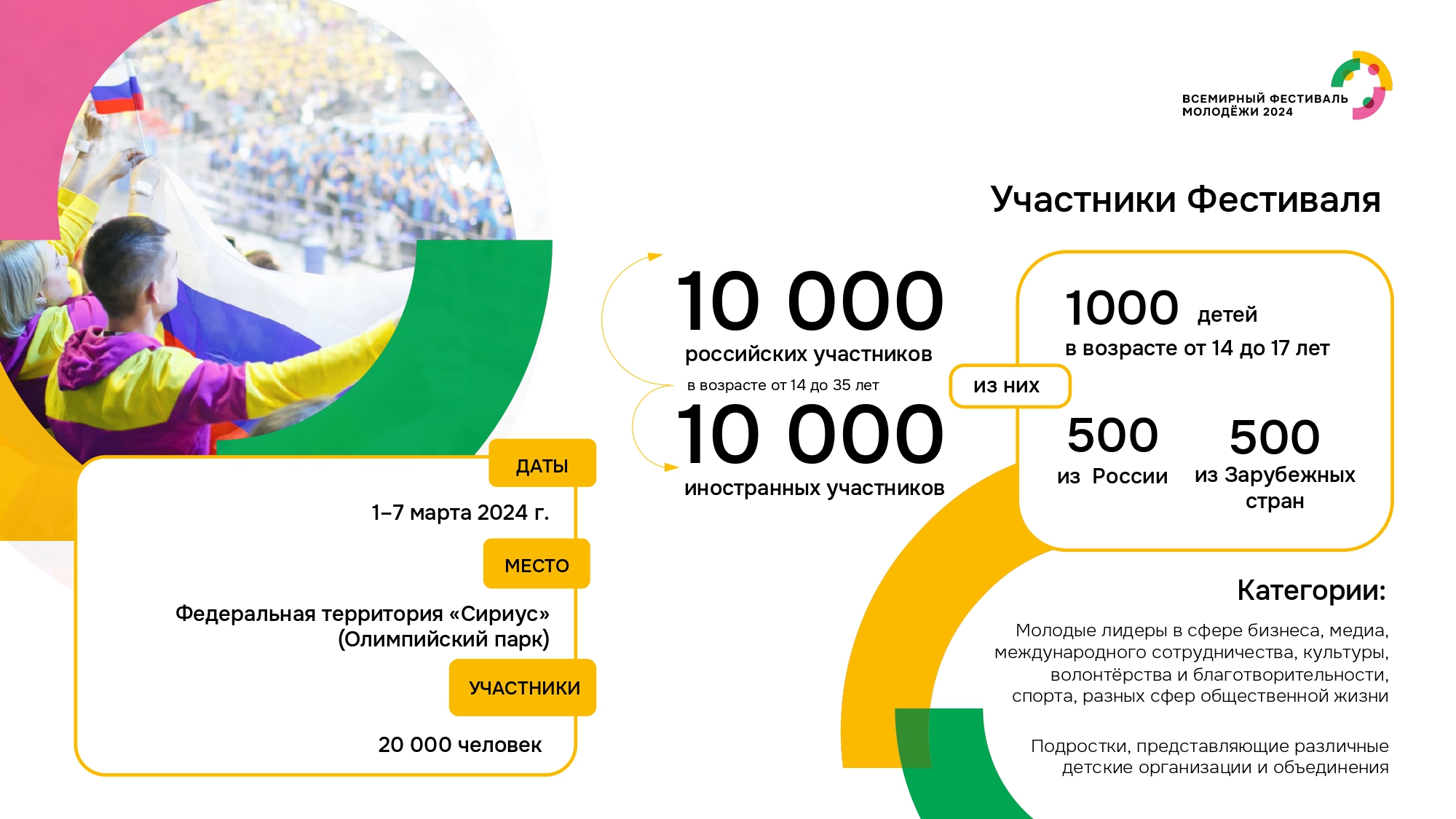 Всемирный фестиваль молодёжи, участниками которого станут более 20 тысяч представителей молодёжи зарубежных стран и России, в том числе - 250 делегатов и 120 волонтёров молодёжи Татарстана