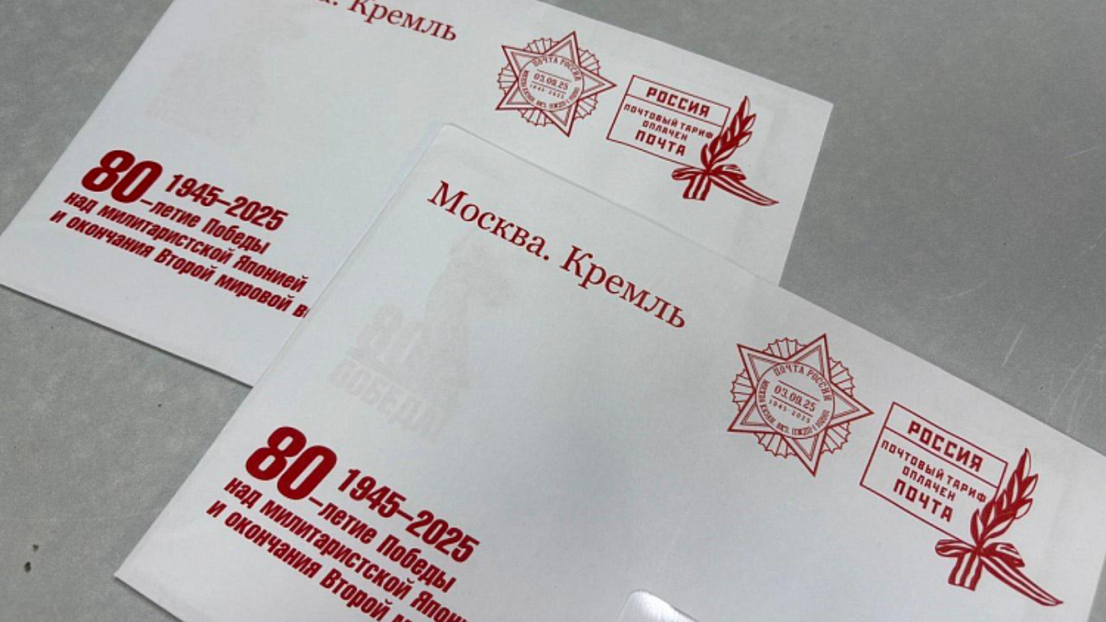 В почтовом отправлении находится именная открытка с поздравлением с 80-й годовщиной Победы над милитаристской Японией и окончания Второй мировой войны, подписанным Президентом России.