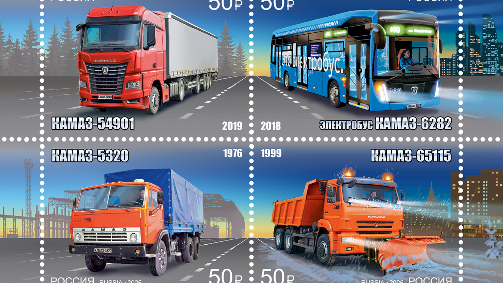 Почта России выпустила в обращение четыре марки, посвящённые грузовой технике и пассажирскому транспорту КАМАЗ. Выпуск приурочен к 50-летию первого грузового автомобиля КАМАЗ, которые сошёл с заводского конвейера в Набережных Челнах в 1976 г.