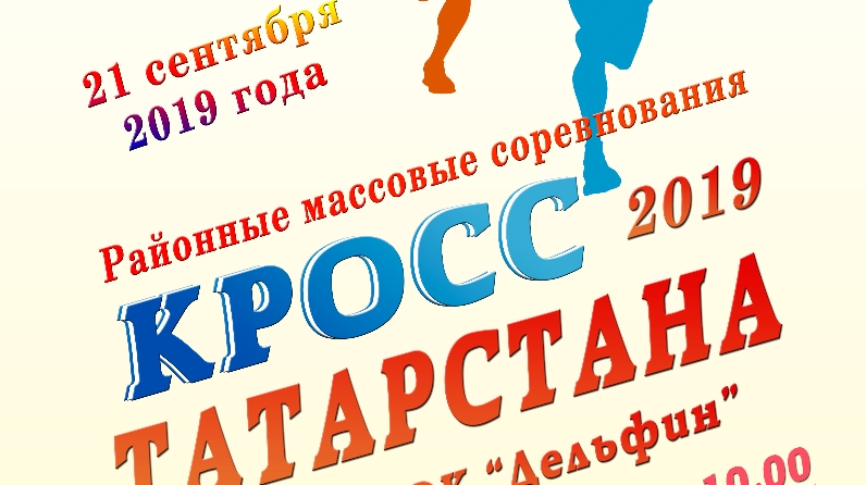 21 сентябрьдә 2019 елда узачак район массакүләм ярыш "Татарстан Кроссы - 2019" арасында мәктәп укучылары, оешма, предприятие һәм авыл җирлекләре. Катнашучыларны теркәү иртәнге 10:00 сәгатькә кадәр 10:45 якын МБУ СОК "Дельфин". 10:45 узачак бию флеш-моб "Триколор туган Республикасы", гомуми разминка. Старт сәгать 11:00 сәгатьтә башлана. Финиш "Яшьлек"стадионында.