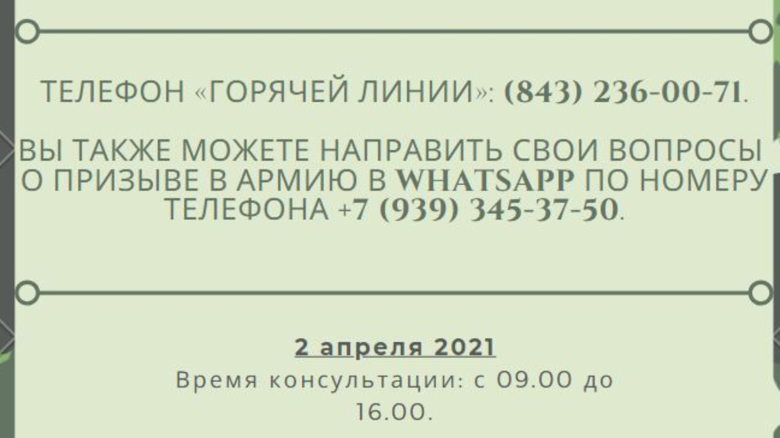 2021 елның 2 апрелендә Татарстан Республикасында Кеше хокуклары буенча вәкаләтле вәкил Татарстан Республикасы Хәрби комиссариаты белән берлектә хәрби хезмәткә чакырылганда гражданнарның хокукларын үтәү мәсьәләләре буенча «кайнар линия» үткәрә. Хәрби хезмәткә чакырылучылар һәм аларның туганнары белән турыдан-туры элемтәнең төп максаты-дөрес мәгълүмат бирү. Татарстан Республикасында Кеше хокуклары буенча вәкаләтле вәкил, Татарстан Республикасы Хәрби комиссариаты вәкилләре булачак хәрби хезмәт турында тулы мәгълүмат алырга, гражданнарга бәхәсле хәлләрне аңлатырга ярдәм итәчәк. "Кайнар линия" телефоны: (843) 236-00-71. Сез шулай ук армиягә чакыруга кагылышлы сорауларыгызны WhatsApp телефон +7 (939) 345-37-50 номеры буенча җибәрә аласыз. Консультация вакыты: 09.00 сәгатьтән 16.00 сәгатькә кадәр.