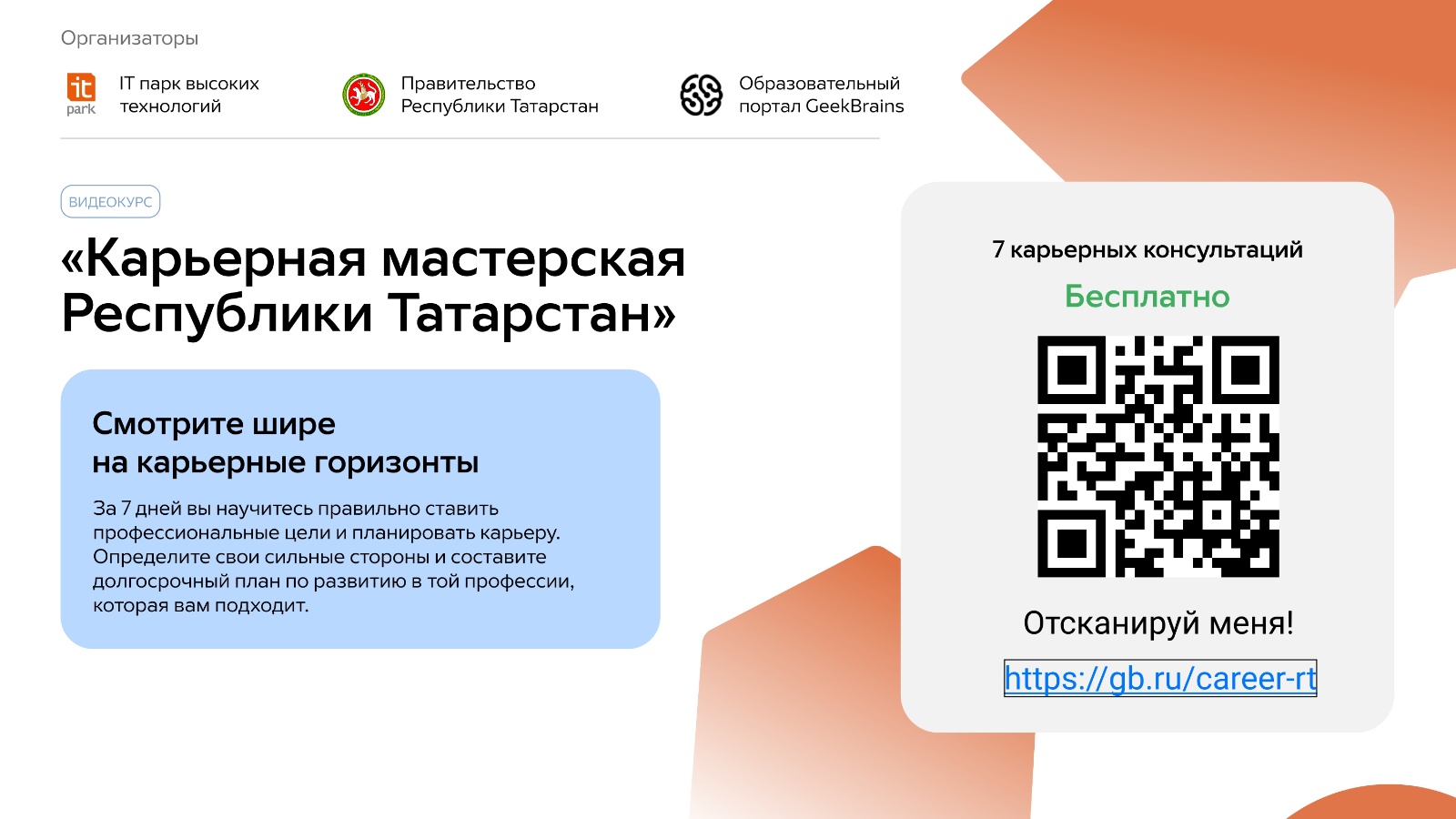 Сезгә хәбәр итәбез, Татарстан Республикасы дәүләт идарәсенең, мәгълүмати технологияләр һәм элемтә министрлыгының GeekBrains белем бирү платформасы һәм «ИТ-парк «югары технологияләр өлкәсендә Технопарк» дәүләт автоном учреждениесе (алга таба – «ИТ-парк» ДАУ) белән берлектә төбәктә «карьера остаханәсе»һөнәри юнәлеш бирү буенча бушлай программа эшли башлый.