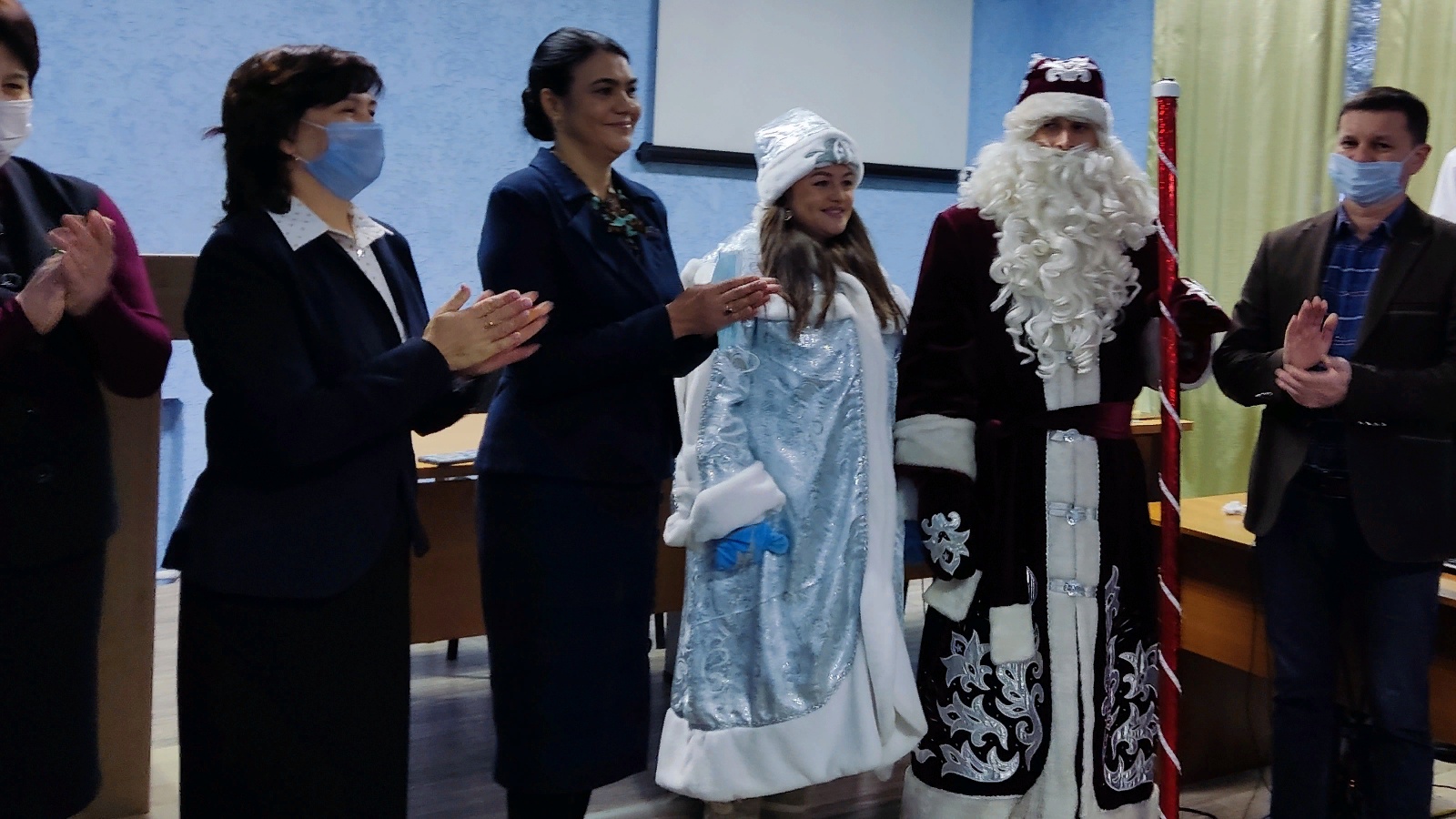 Район мәдәният йортының Кыш Бабае һәм Кар кызы "Үзәк район хастаханәсе" хезмәткәрләрен якынлашып килүче Яңа ел белән котладылар һәм аларга сәламәтлек, авыр хезмәтләрендә уңышлар теләделәр