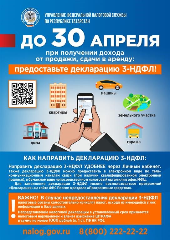 Мөлкәтне сатудан яки сатудан керемнәр алган гражданнар, шулай ук мөлкәтне арендага бирүдән кергән гражданнар 30 апрельгә кадәр 3-НДФЛ декларациясен тапшырырга тиеш