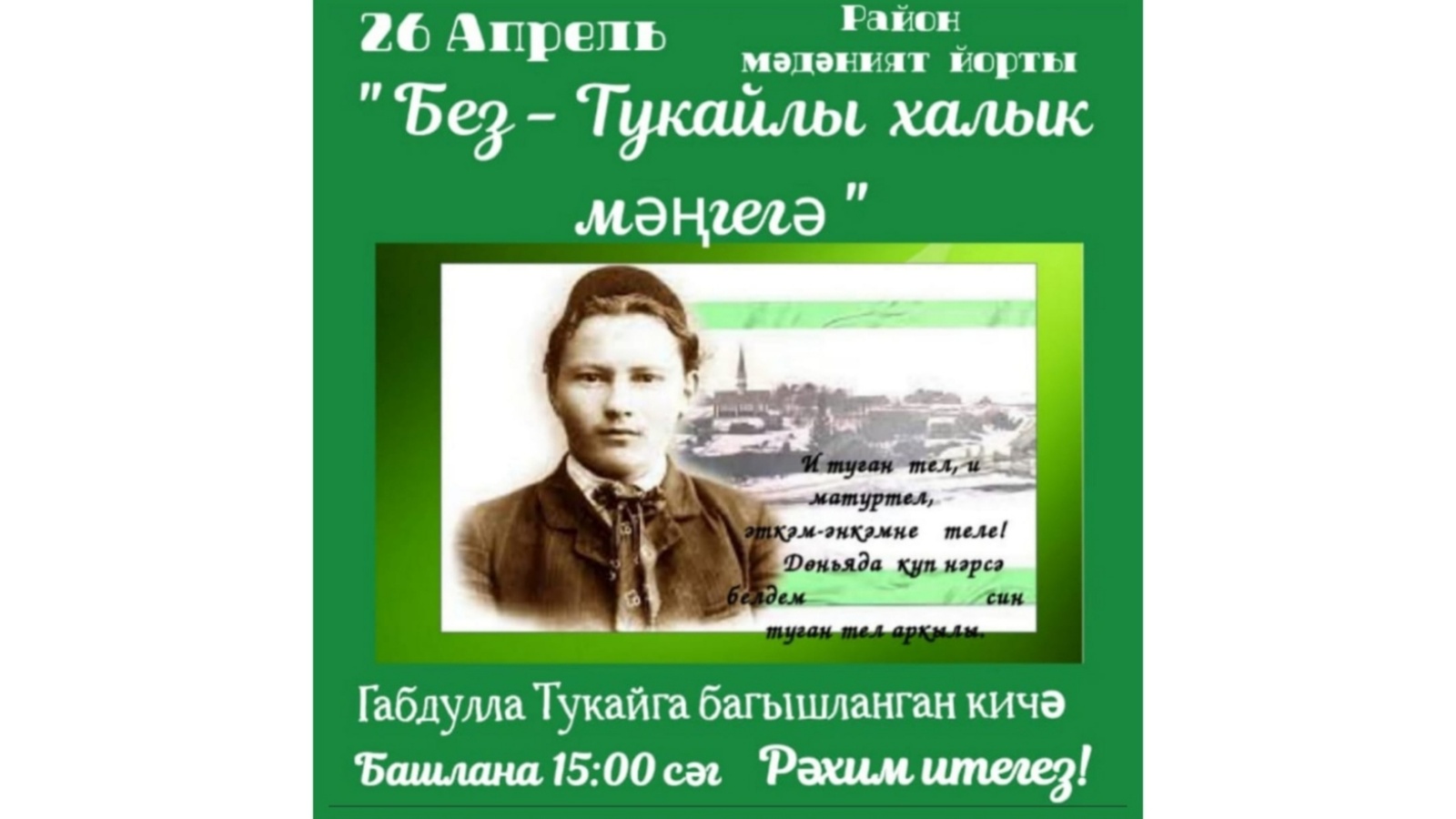 26 апрель көнне 15: 00 сәгатьтә район мәдәният йортында Г.Тукайга багышланган чара узачак.