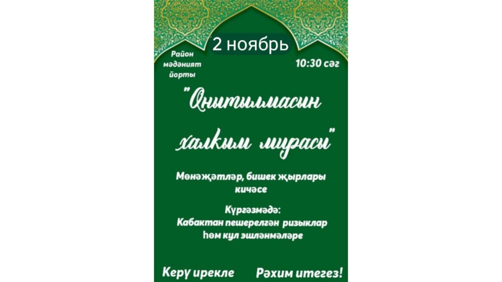 2022 елның 2 ноябрендә район мәдәният йортында мөнәҗәтләр һәм бишеклеләр бәйгесе узачак.