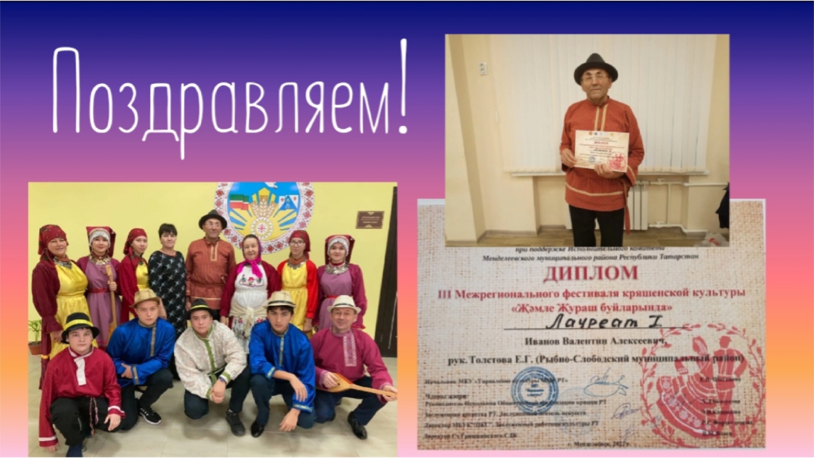 Бердибәкнең "Тәнкәләр" фольклор ансамбле солисты Иванов Валентин Алексеевич l дәрәҗә лауреаты дипломы белән бүләкләнде. Җитәкчесе Толстова Евдокия Григорьевна.