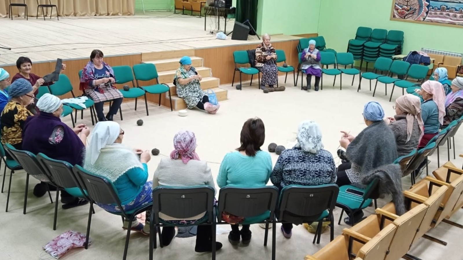 Күгәрчен авылы мәдәният йортында йон - оекбашлар бәйлиләр һәм безнең солдатлар өчен посылкалар җибәрәләр.