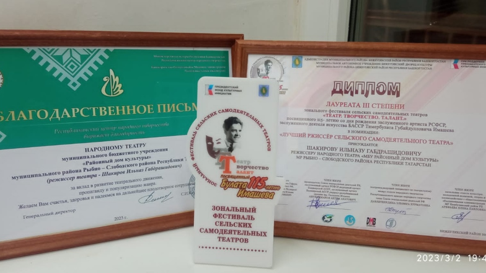 "Авыл үзешчән театрының иң яхшы режиссеры" номинациясендә III дәрәҗә лауреат дипломы белән РЮА режиссеры Шакиров Илназ Габдрәшид улы бүләкләнде.Театр хәрәкәтен үстерү, пропаганда һәм популярлаштыру, 'Халык театрына" керткән өлеше өчен Рәхмәт хаты тапшырылды.