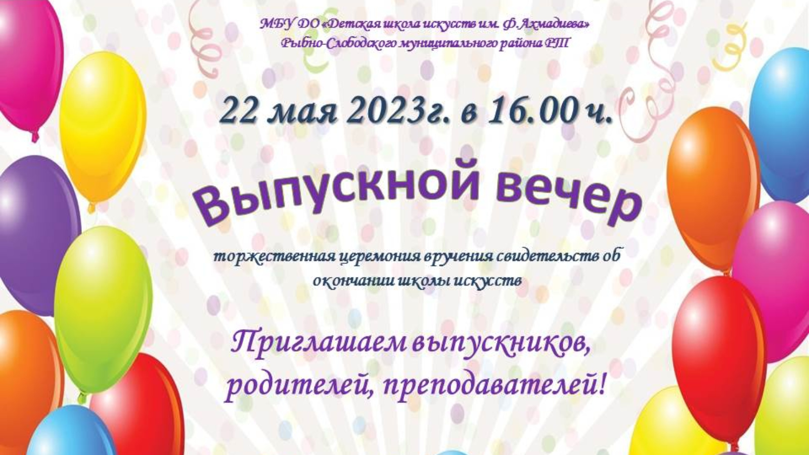 2023 елның 22 маенда балалар сәнгать мәктәбендә музыка, хореография һәм театр бүлекләре укучыларының чыгарылыш кичәсе узачак. Чыгарылыш сыйныф укучыларын котлыйбыз!