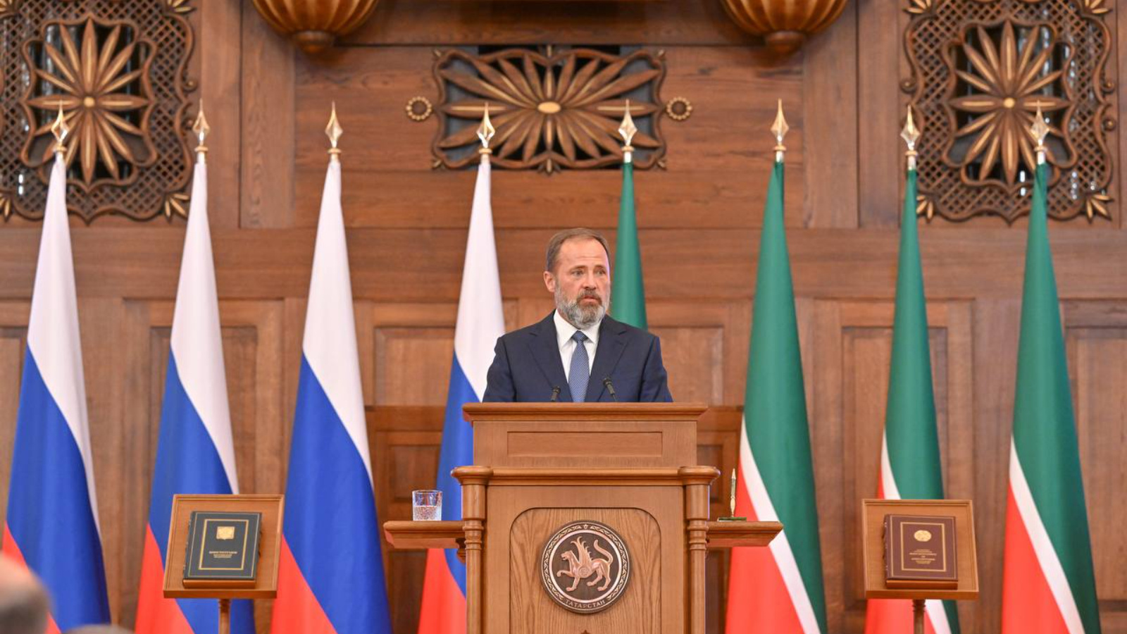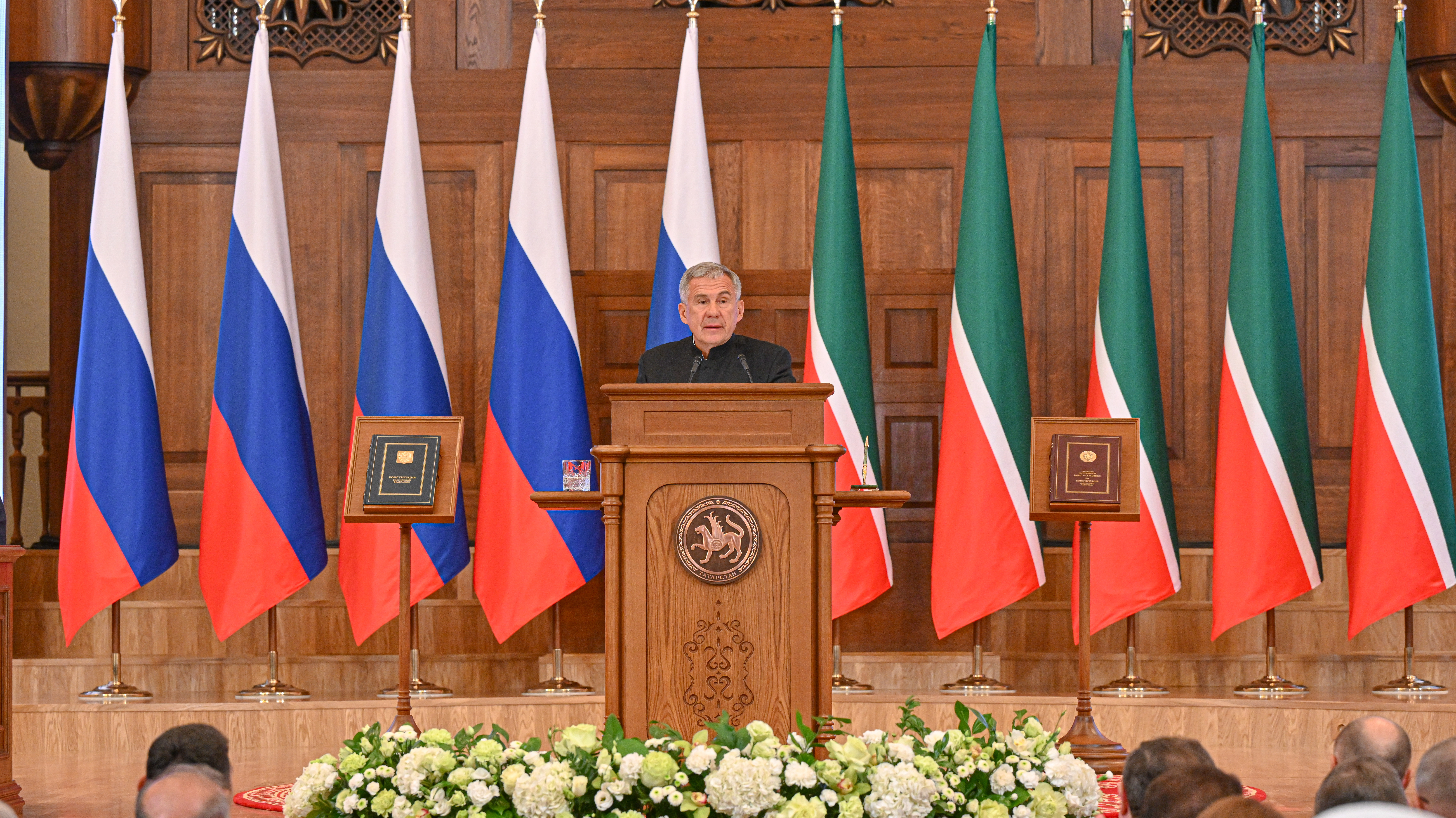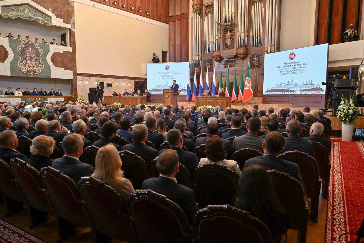Тантана азагында Татарстан Республикасының сайланган башлыгы халыкка ышаныч белдергәннәре өчен рәхмәт белдерде һәм төбәкнең интенсив үсешенә юнәлешне дәвам итәчәген әйтте: «Татарстанның күпмилләтле халкы сайлавын кабул итеп, республиканың барлык халкы, традицияләрне, кыйммәтләрне һәм туган җиргә мәхәббәтне саклап калган һәм безгә тапшырган ата-бабалар, шулай ук киләчәк буыннар алдында республика язмышы өчен җаваплы булуымны аңлыйм. Бүген безнең республика-илнең терәк төбәге. Бу еллар эчендә Татарстан тулай төбәк продуктын һәм сәнәгать җитештерүен арттырды, цифрлы трансформация буенча лидерга әверелде. Милли проектлар һәм республика программалары кысаларында тормыш сыйфатын күтәрү, шул исәптән торак, социаль объектлар, юллар төзү һәм капиталь ремонтлау, ишегалларын һәм җәмәгать урыннарын төзекләндерү буенча гаять зур эш башкарылды».