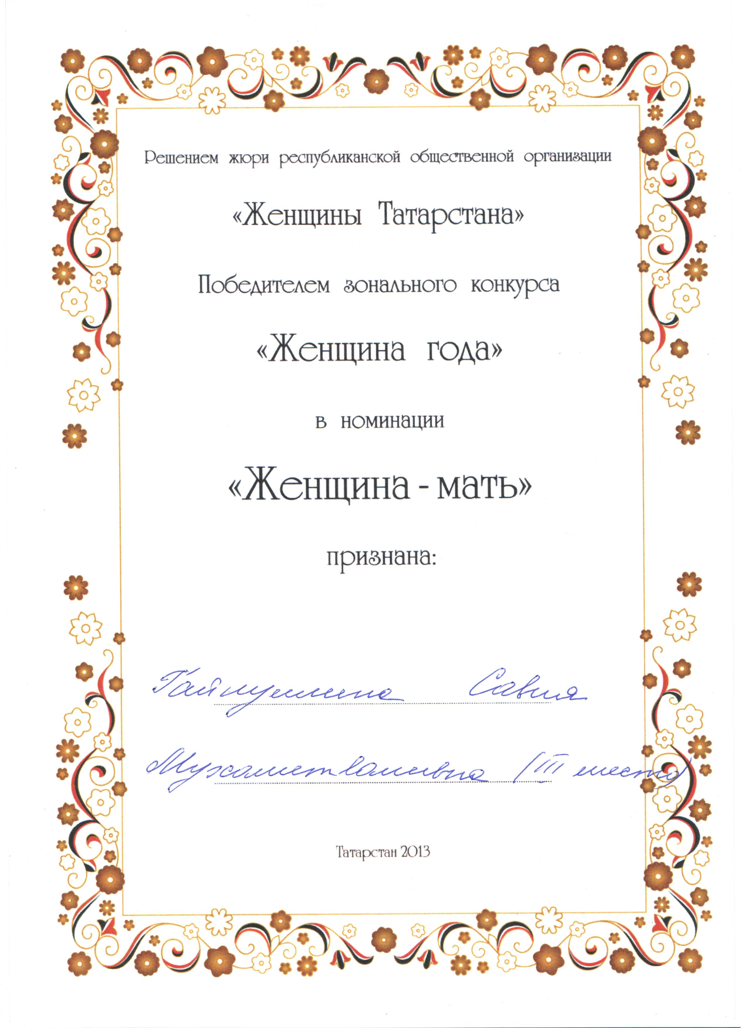 Гайнуллина Савия Мухаматвалеевна, 25.07.1940 г.р., жительница Верхне-Тимерлекского сельского поселения, участвовала в номинации «Женщина ‑ мать» и получила свое заслуженное 3 место. Вместе с супругом они воспитали шестерых образцовых детей. Благодаря старанию и верности друг-другу на сегодняшний день они живут душа в душу, радуясь примерным детям и образцовым внукам.